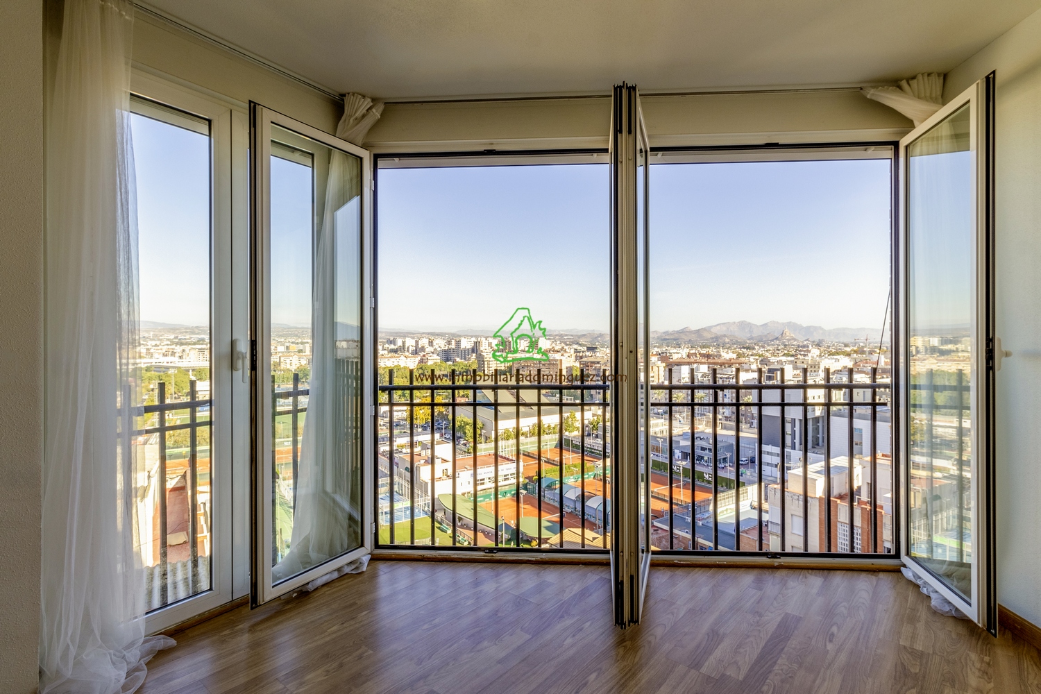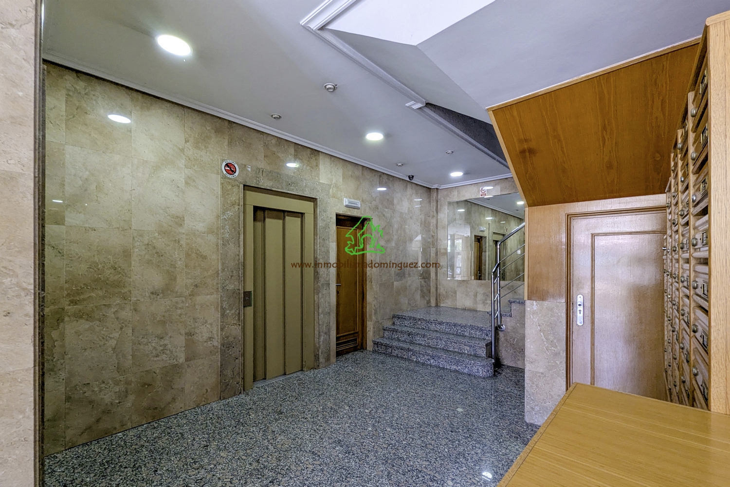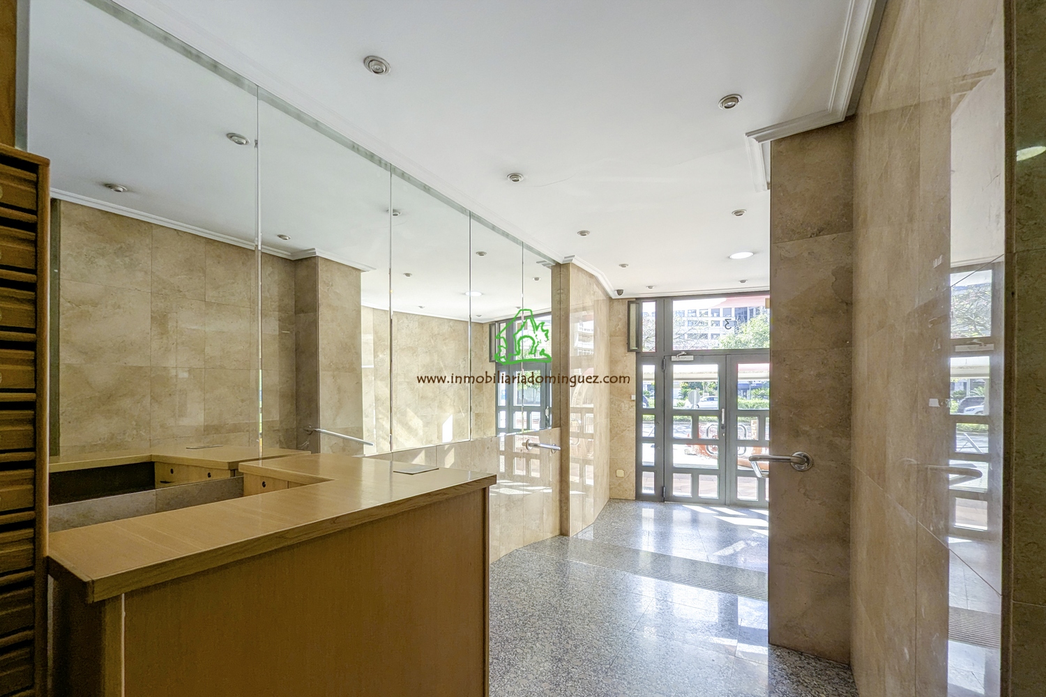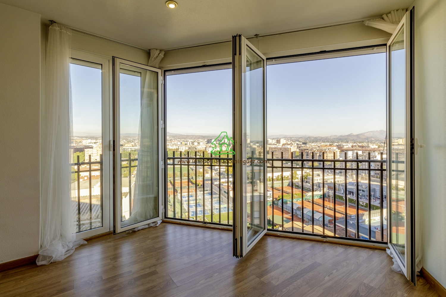 Esta luminosa vivienda, con una superficie de 111m² construidos, está situada en la planta 13 de un edificio con ascensor. Está ubicada en la plaza Díez de Revenga, a un paso de El Corte Inglés.